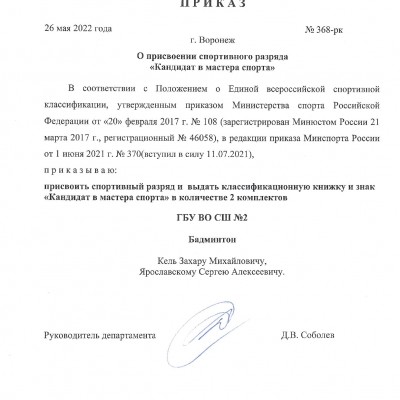 26 мая департаментом физической культуры и спорта Воронежской области издан приказ о присвоении спортивного разряда "Кандидат в мастера спорта" двоим спортсменам отделения бадминтона в учреждении: