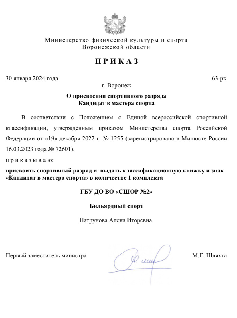 1 спортивный разряд - Гречкина Анастасия (тренер - Тычинин В.Ю) , за первое место в первенстве Воронежской области по Комбинированной пирамиде 2023 года до 19 лет.