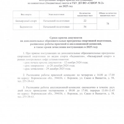 Объявлен индивидуальный отбор для зачисления в СШОР № 2 в 2025 году за счет субсидий из бюджета Воронежской области